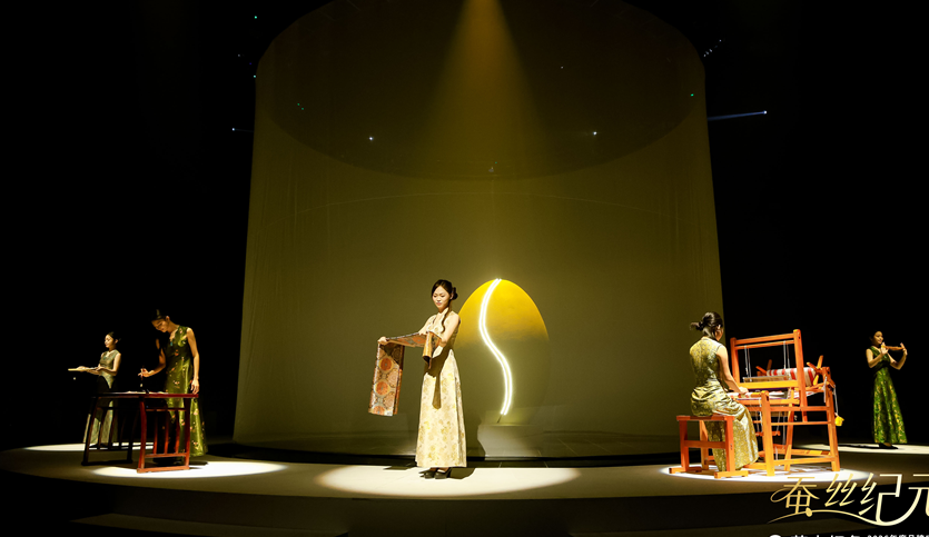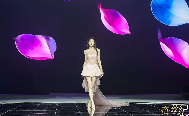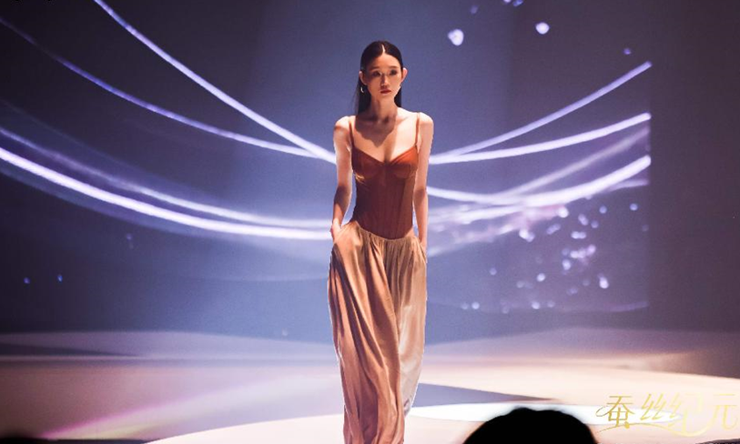 草本初色突破传统秀场边界,将“以蚕丝为脉”具像化表达,深度融合科技与文化,打造沉浸式蚕丝美学空间。发布会首次采用全息影像与360度环绕式舞台技术, 90%透明度的全息纱幕投射出蚕丝生长、蚕蛹破茧、宋锦织造的动态场景,无需3D眼镜即可让嘉宾置身3D幻境,实现视觉、触觉、嗅觉与文化体验的四重升级。现场打造的“丝路映射”艺术打卡区,设置破茧映月、光阴丝缕、锦库回响等六大主题空间,通过实物陈列、互动装置、非遗表演等形式,让嘉宾近距离感受蚕丝文化的深厚底蕴与宋锦技艺的精湛魅力,让秀场成为兼具视觉震撼与文化内涵的盛宴。