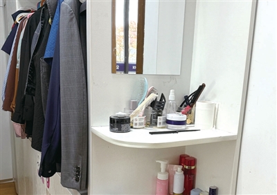 3月6日,记者在白杨派出所看到小型衣帽间有2个。在户籍窗口旁有台身份证自助服务机,可以自助拍摄身份证照片,机器旁就是一个挂着一排西装衬衫的衣架,更多的款式放在人像采集室的橱柜里,女生的有圆领短袖针织衫、泡泡袖短袖、“小香风”外套等,小朋友的颜色相对丰富,各式POLO衫,各种尺码都有。男生款式和颜色都比较有限,钟悦她们选了牛仔马甲、格子衬衫、POLO衫、复古风立领衬衫等。