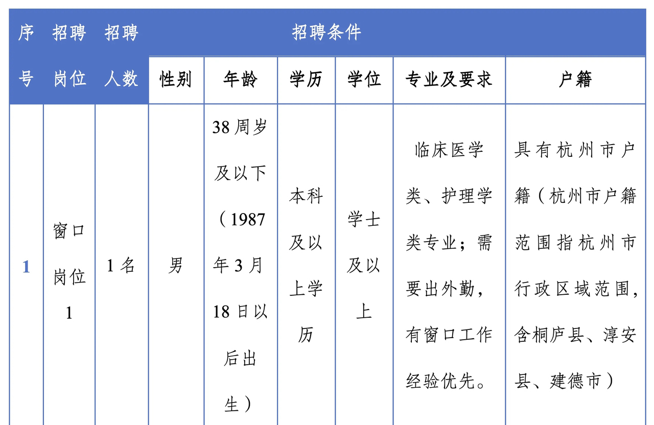 “窗口岗位1”专业要求由原来的“临床医学类、护理学类专业”调整为“医学门类、法学门类” ,同时相应延长该岗位报名时间至2026年3月27日下午5时(受理报名时间为工作日上午9:30-11:30,下午2:00-5:00)。报名地点变更为:浙江省杭州市拱墅区白石巷318号杭州人力资源产业园北楼1113室。