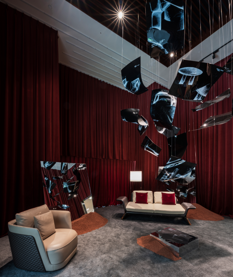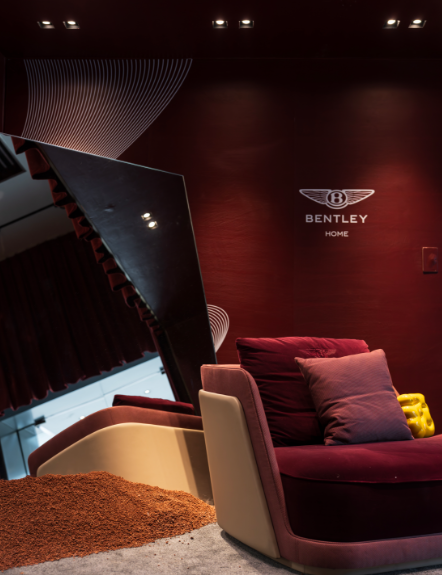 一层艺术展区,跨界美学的震撼。此次特别推出Bentley Home杭州首发限定设计师手稿原版,并通过镜面装置、热弯亚克力的流动形态,搭配砖红色火山石先锋艺术装置,四周环绕NEWENT沙发、RAMSEY休闲椅与RICHMOND贵妃榻在虚实折射间构建出克制美学与自然意象交融的空间语境,诠释宾利家居将流线雕塑语言与当代时尚元素融入生活空间的设计哲学。兼顾触觉体验与视觉美学,既彰显Bentley Home的低调奢华,又与春日自然美学巧妙呼应,实现奢雅与自然的完美平衡。户外特别陈列杭州西湖店新款欧陆GT极致版与展馆入口花卉装置形成视觉叙事共振,既呼应春日生机,更与Bentley Home的隽雅风范调性高度契合,彰显品牌匠心呈现底蕴。