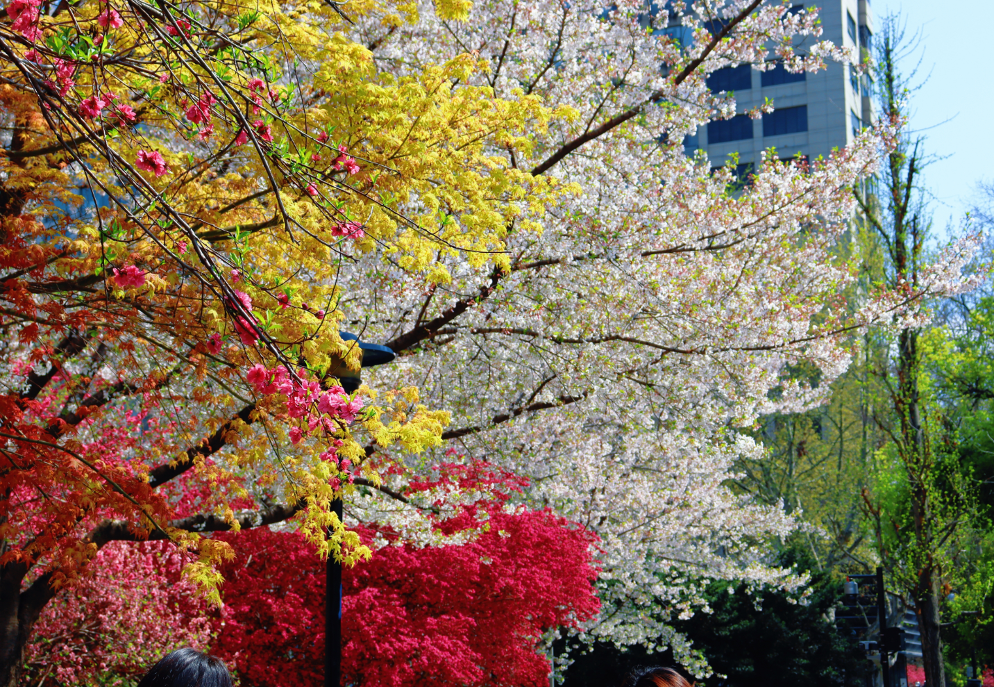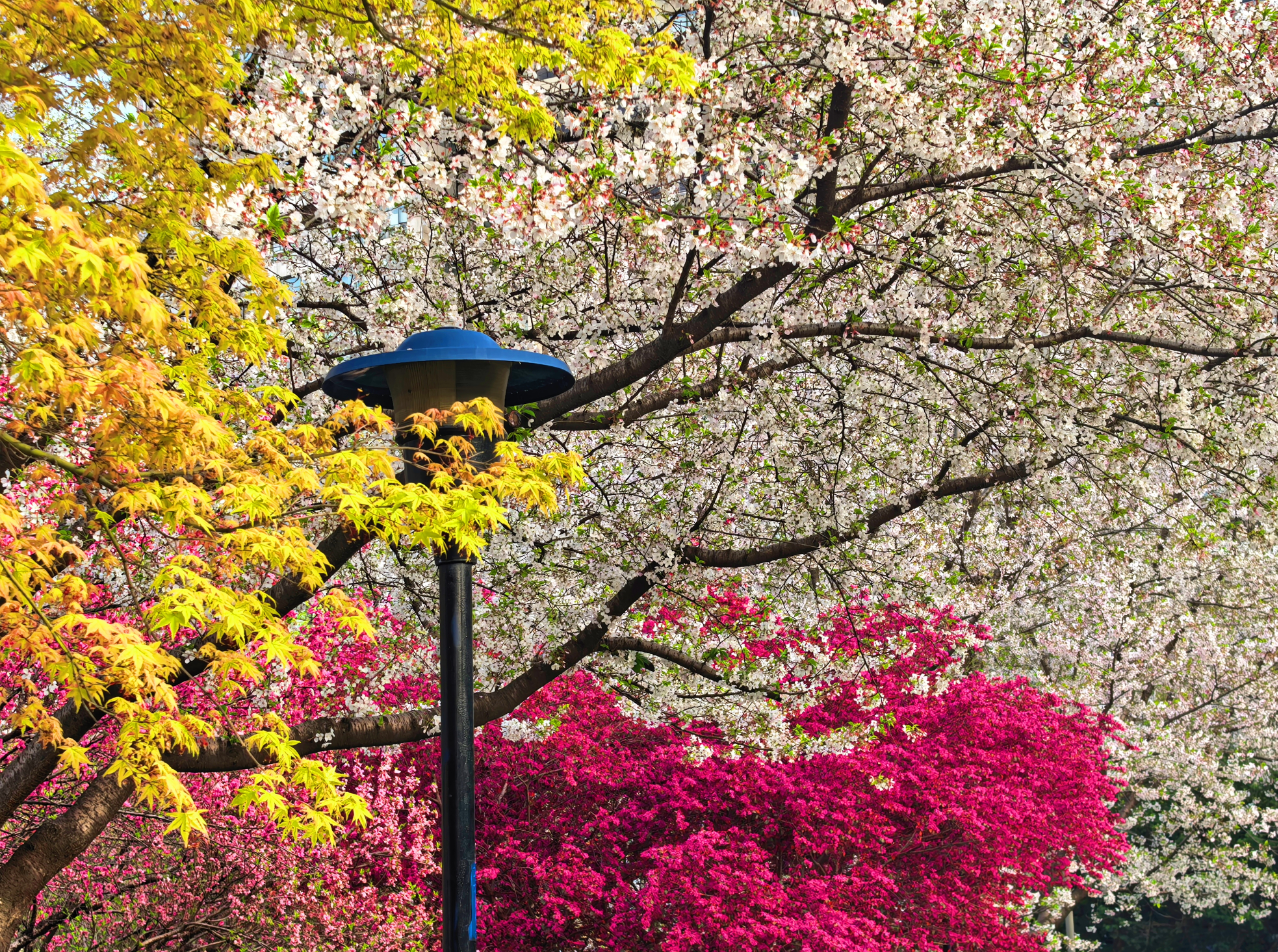 粉白樱花如云似雪,红花檵木鲜红叶片亮眼夺目,鸡爪槭新叶呈明亮橙黄,嫩绿新芽与枝干交错,四种色彩交织,宛如打翻自然调色盘 。