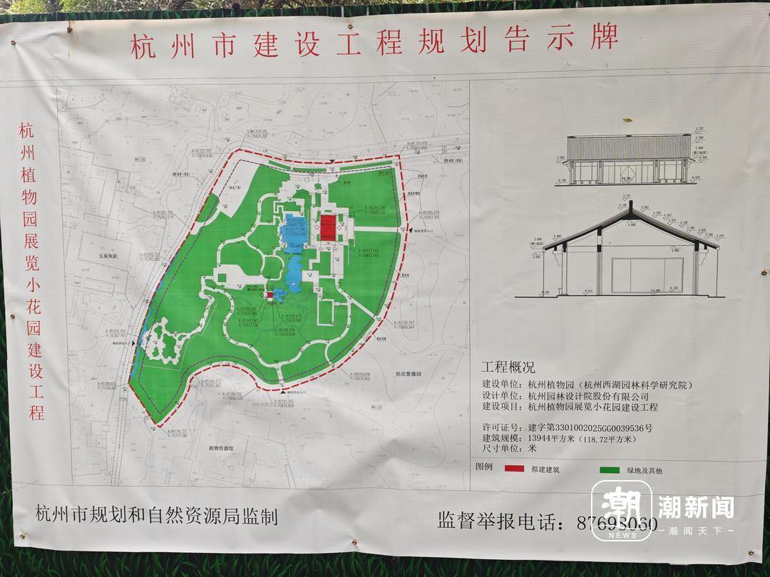 在施工围挡上悬挂着《杭州市建设工程规划告示牌》,告示牌上的信息显示,正在进行的工程为“杭州植物园展览小花园建设工程”,规模为13944平方米,其中建筑面积118.72平方米。