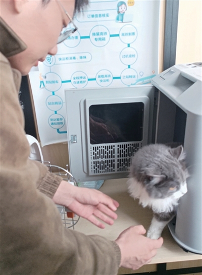 “宠物和旅客是在同一列列车上,得顾及其他旅客的乘车体验感,定制的宠物箱比较智能,供氧、通风、除臭,高铁托运宠物时,会把宠物箱放进车厢的行李柜内。”