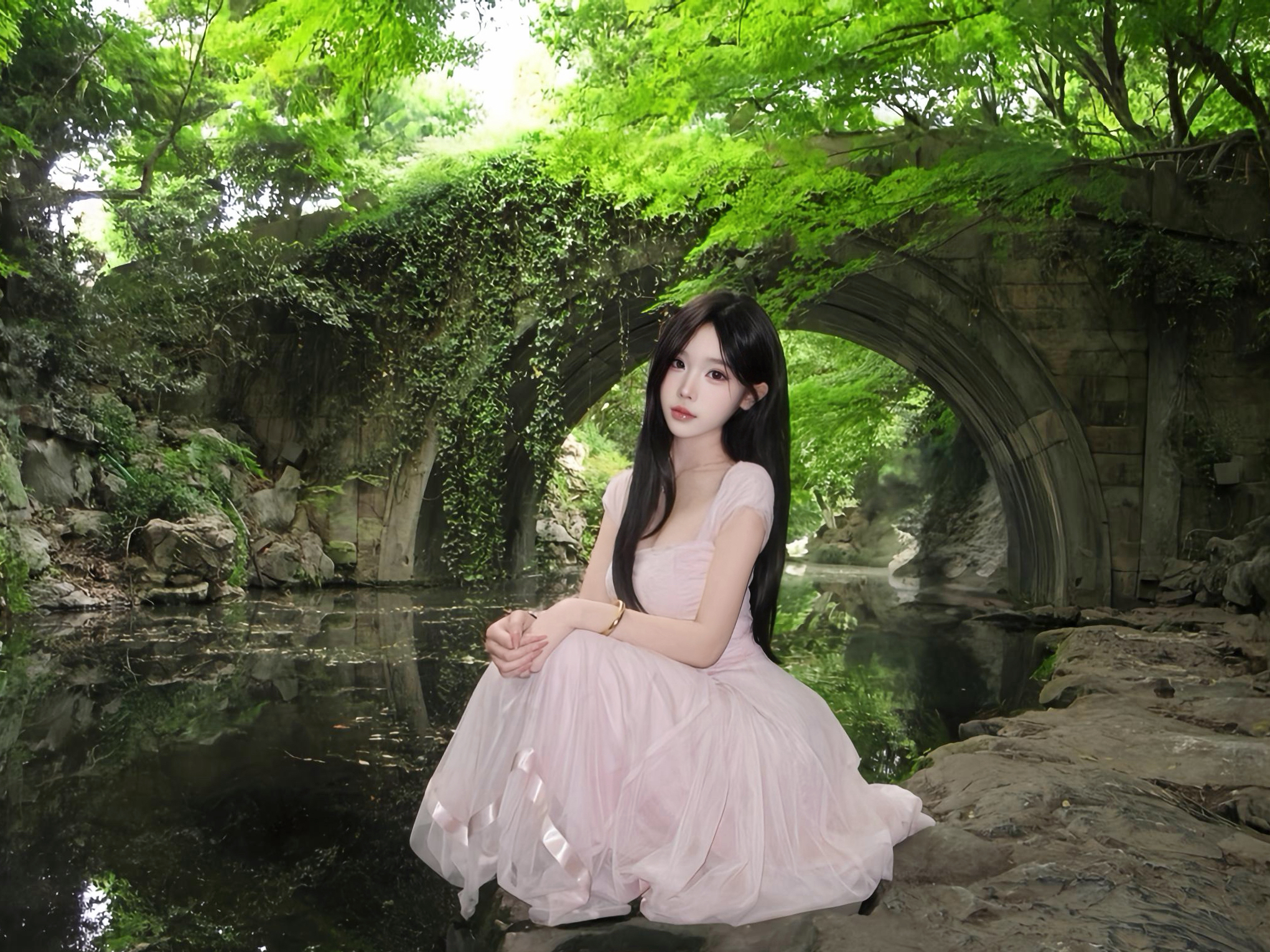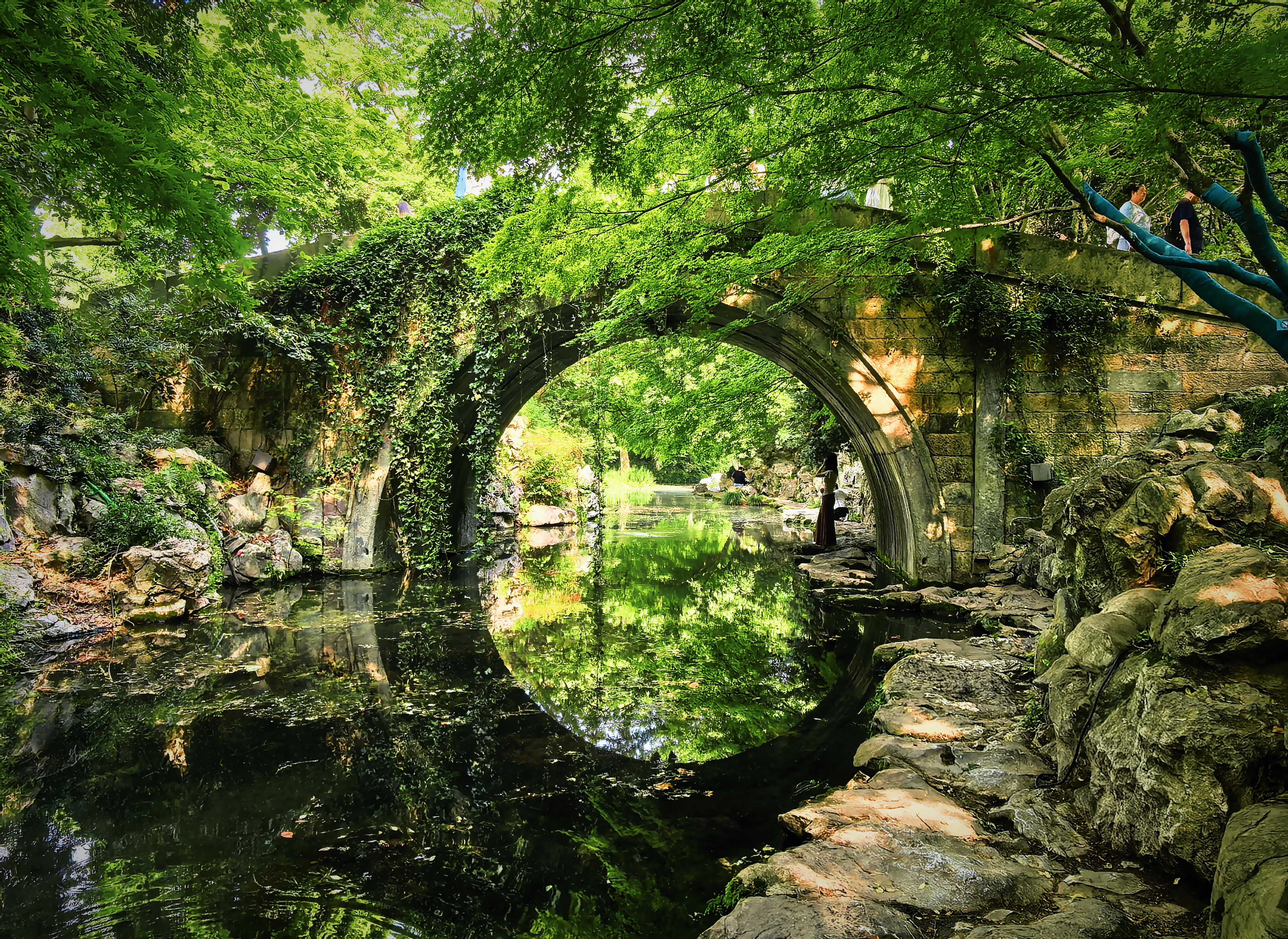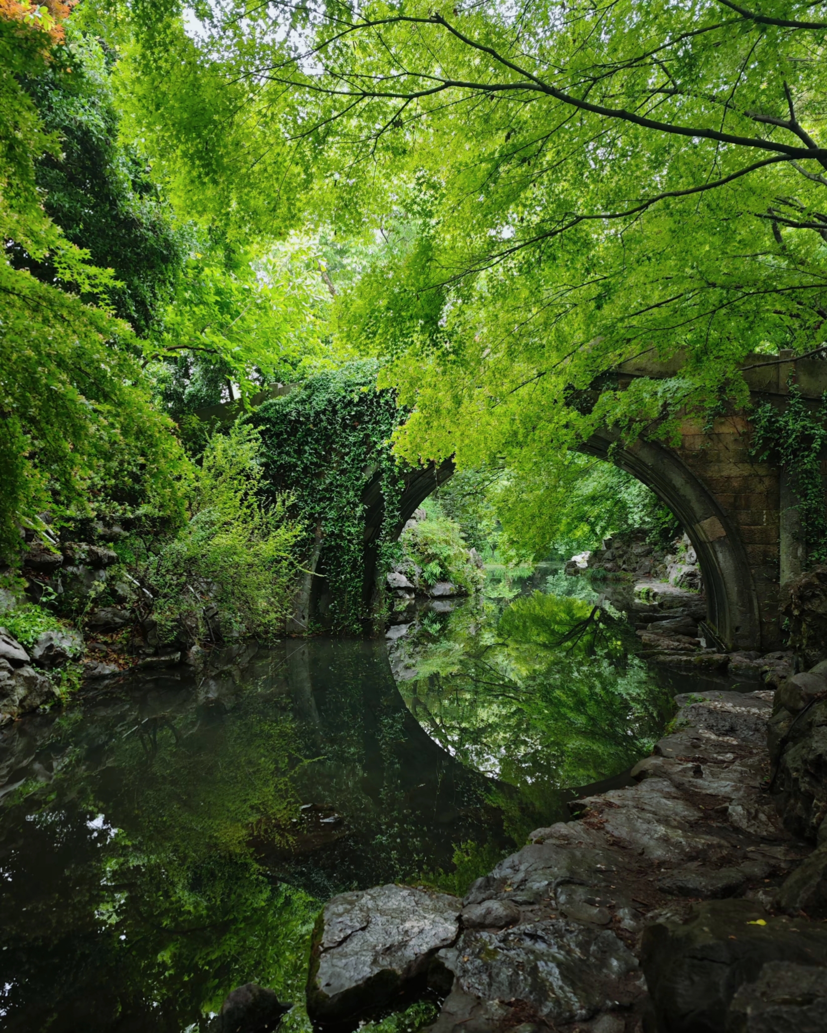 桥边的藤蔓垂落成绿色瀑布,阳光洒下斑驳光影。桥洞、绿植和溪水在镜头里完美同框,营造出宛如童话世界"绿野仙踪"般的梦幻效果!