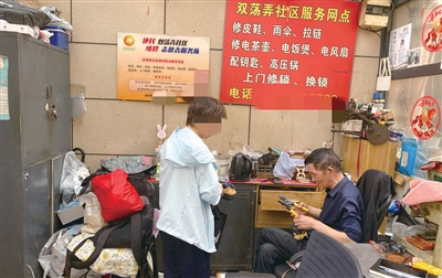 摊位墙壁上挂着两块牌子,一块写着“双荡弄社区志愿者服务队”,社区维修网点服务项目包括修皮鞋、雨伞、拉链、修电茶壶、电饭煲、电风扇、配钥匙、高压锅、上门修锁、换锁等。