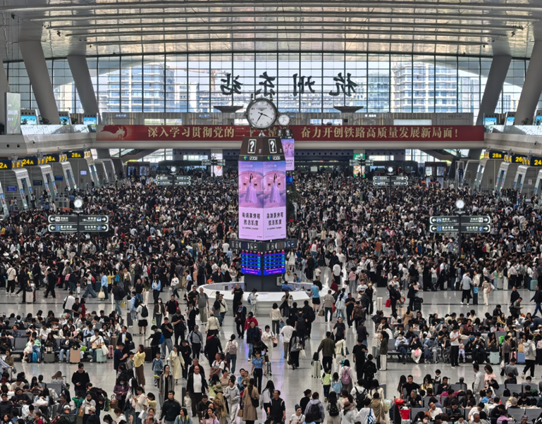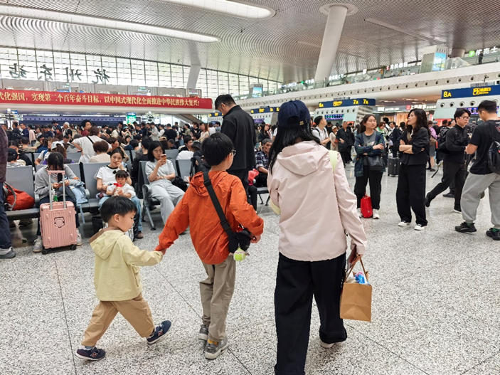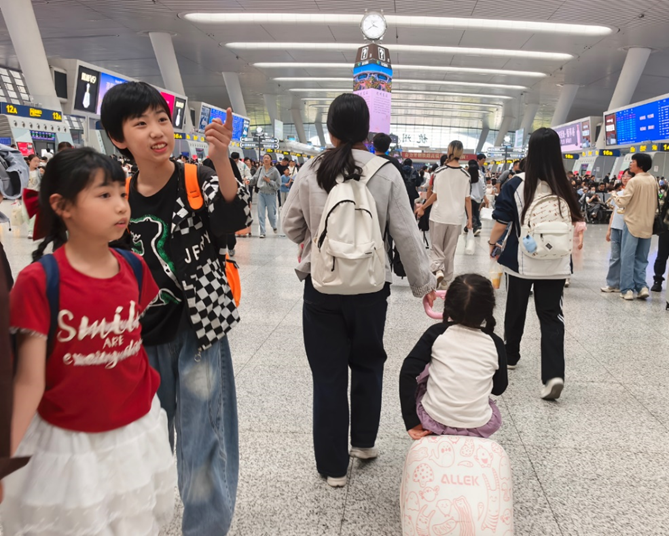 进站口队伍排成长龙,候车大厅里满是孩子们嬉闹的身影,清脆的笑声此起彼伏。乘客们笑着打趣:“这是全杭州的孩子都集体出动了吧?”