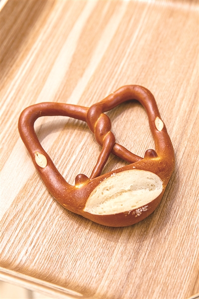 5 碱水面包Pretzel 盐、面皮、苏打和碱液的综合作用,让这种面包呈现出一种独特的风味。最常见的为绳结形状,一长条面团的末端缠绕在一起,然后扭转显得对称。在杭州的面包店,碱水已经五花八门发展出了碱水球、碱水棍、碱水酥等各种变体。还有混合了芝士、巧克力、肉桂、坚果等各种口味的碱水。 在德国,碱水面包的起源据说是一群绝望的面包师们被扣押为人质后的发明。至少从12世纪开始,碱水结就作为面包师的标志。在欧洲旅游的话,如果看到店门口挂一个像是碱水结一样的挂件,可以大胆猜测就是面包师公会所在地。碱水有软硬两种,软款适合尽快吃掉,硬款则可以保存较长一段时间。