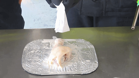 喷在皮肤上的防晒喷雾 遇明火也可燃 如果这些防晒喷雾喷到了人的皮肤上,再接触到明火,还会燃烧吗? 消防员找来鸡腿模拟人的皮肤。在喷上防晒喷雾,约5秒后,消防员拿出点火器点火,此时鸡腿突然着火,还伴有滋滋的声响。