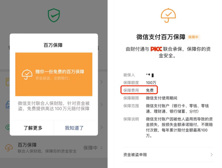 “百万保障”到底是什么? “百万保障”是指微信支付账户、支付宝账户因被他人盗用而导致资金损失,按损失金额承诺不限次赔付,每年累计赔付金额最高100万元的安全保障。